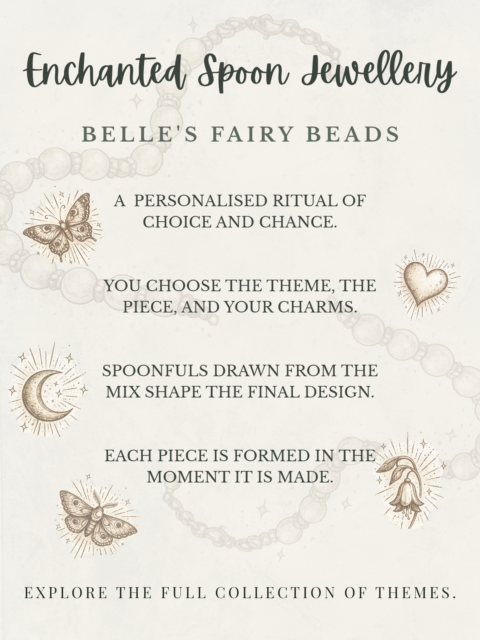 Lucky Scoop Jewellery is personalised jewellery shaped through a ritual of choice and chance. You select the theme, the piece, and your charms; the final design is entrusted to the hand of fate, drawn from the Midnight Moth bead mix.